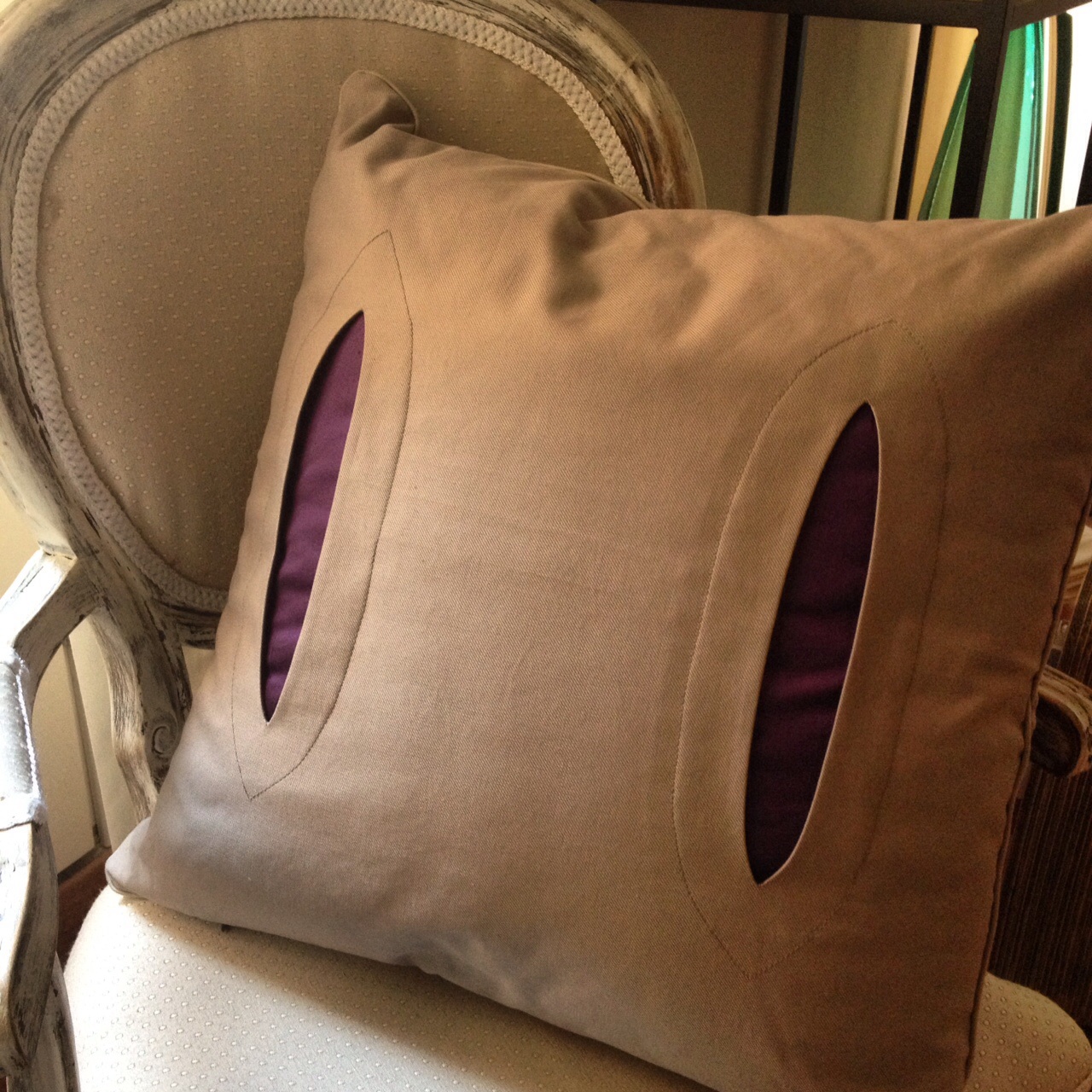 Ho iniziato una stimolante collaborazione con l’atelier di Fiorella Ciaboco, una sarta stilista appassionatissima ed entusiasta del suo lavoro (io pazza dei suoi abiti dal taglio sartoriale così raro da trovare) e le ho disegnato una piccola collezione di cuscini per la casa che riprendono le lavorazioni sartoriali tanto preziose nelle sue creazioni. Uno di questi, il modello “Oblò”, è caratterizzato proprio da questo contrasto tra lino color sabbia e inserti in shantung color ciclamino.