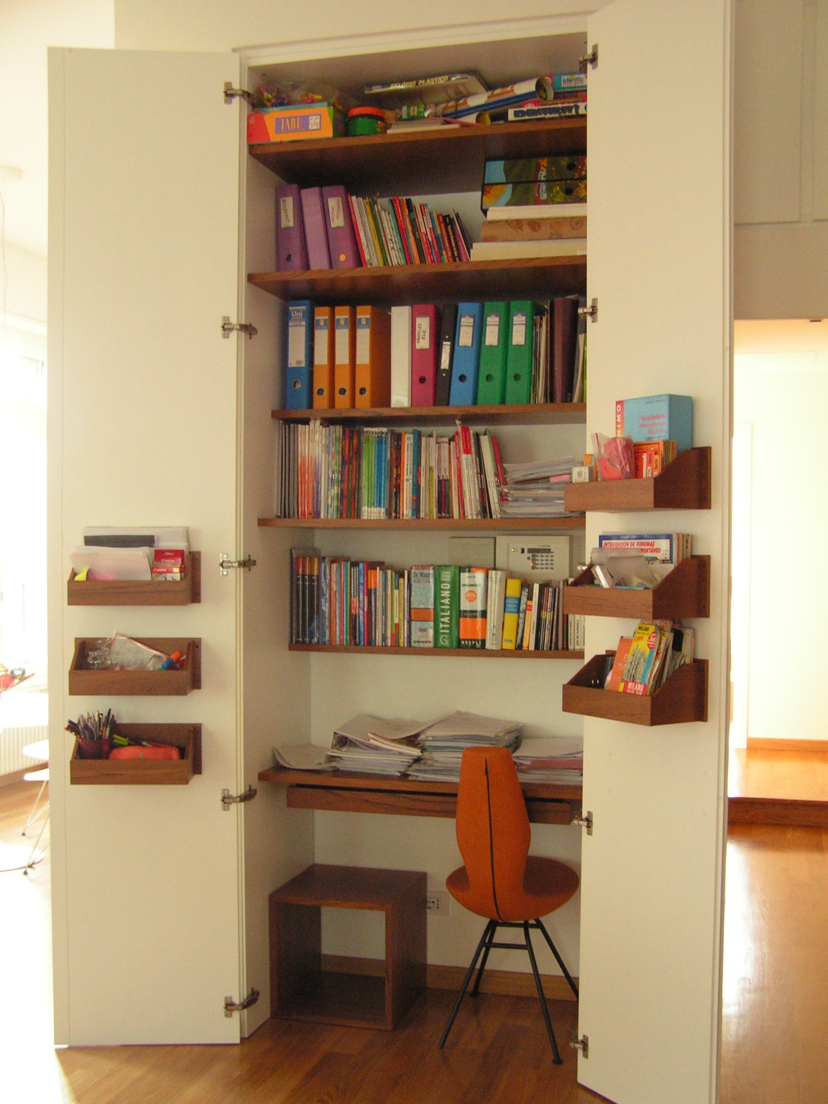 Essendo nella zona nobile dell’abitazione e dedicata all’ospitalità, non potevo certo lasciare a vista un angolo che raramente si riesce a rendere gradevole, così questa grande nicchia l’ho dotata di due alte ante a battente tipo armadio, da chiudere all’occorrenza, accessoriate nella loro parte interna con contenitori a vaschetta per riporre la piccola cancelleria.