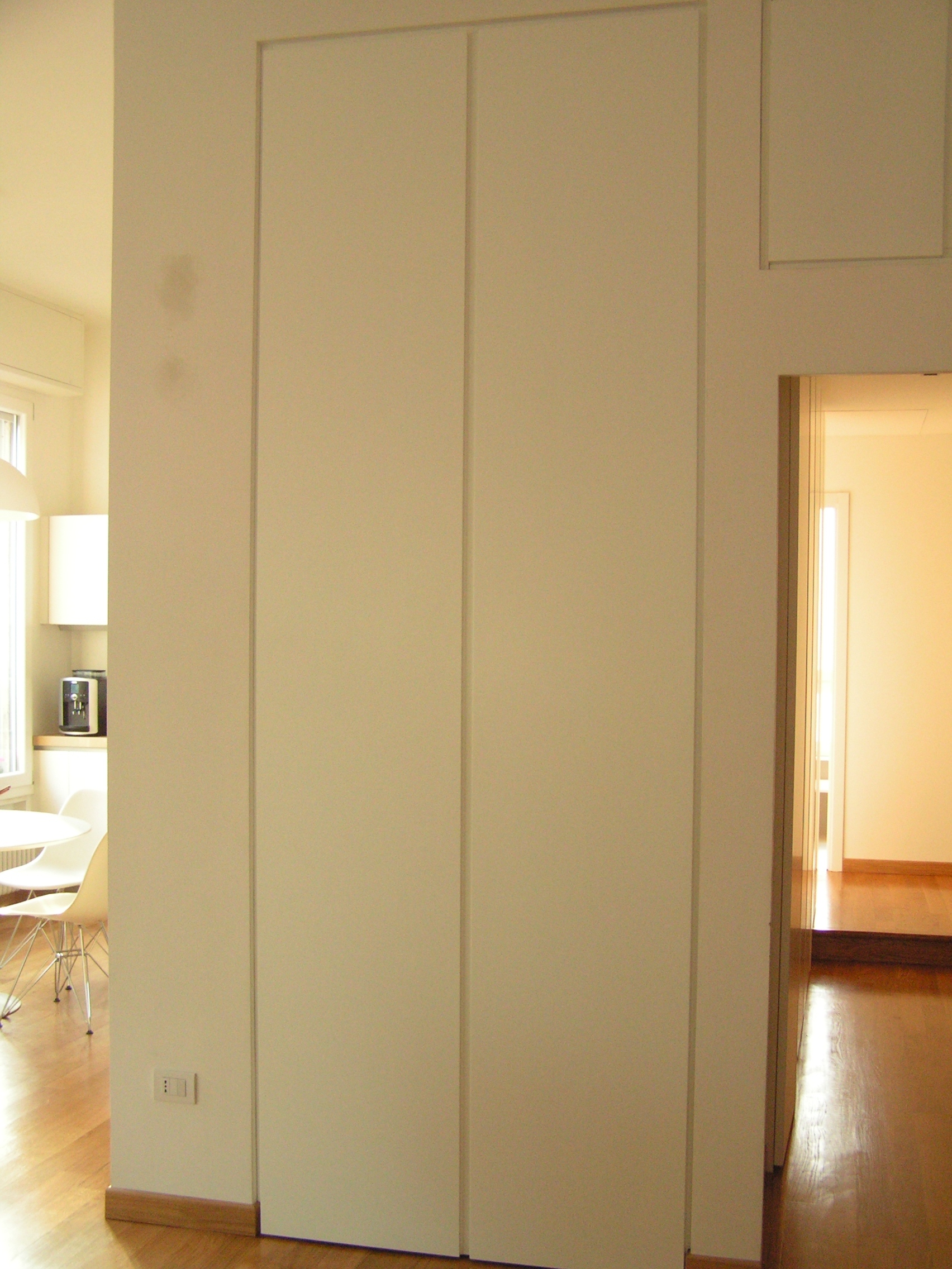 Quando proposi l’idea furono felicissimi, il fatto di avere un angolo di lavoro nella zona più accogliente e luminosa dell’appartamento, comoda con la cucina e vicino alla porta che da accesso alle camere, così da tenere sempre sotto controllo la nanna del piccolo, ma soprattutto il poter nascondere in pochi attimi il tutto alla vista degli ospiti, semplicemente inserendo la sedia sotto allo scrittoio, spegnendo il pc, e chiudendo le ante, gli sembrò quasi un miracolo.
