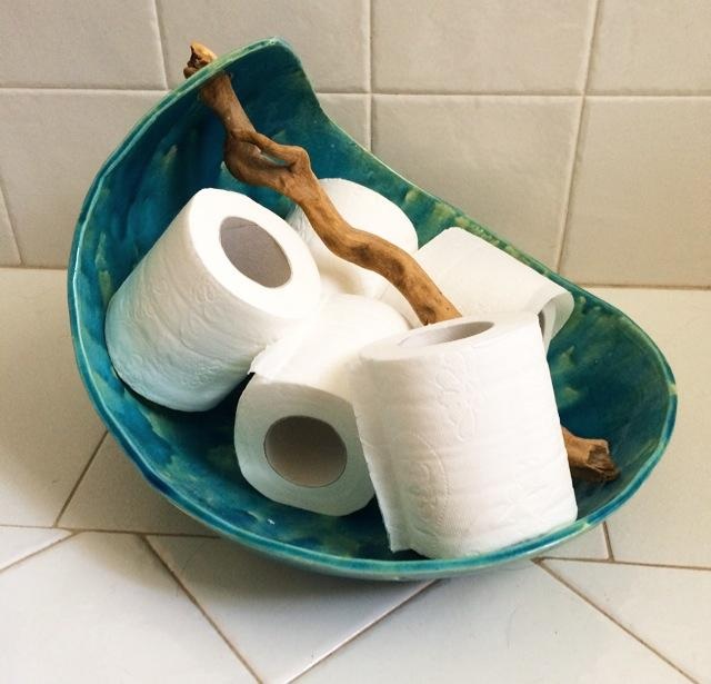 Nel Petit Foyer, ho adottato una soluzione che, già in precedenza, avevo provato nella casa ben più grande e spaziosa che ho sulle colline dell’Oltrepò, riporre i rotoli non all’interno dell’armadietto del bagno, ma in un contenitore a parte da posare vicino al Wc. In questo caso, ho utilizzato una ciotola creata appositamente per lo scopo da me, in ceramica smaltata color turchese con un inserto di legno, uno di quei bei rami che si raccolgono sulle sponde dei fiumi o in riva al mare. Oltre ad essere comoda e a portata di mano nel “momento del bisogno” è anche decorativa e molto apprezzata dai miei ospiti che spesso mi chiedono di averne una uguale.