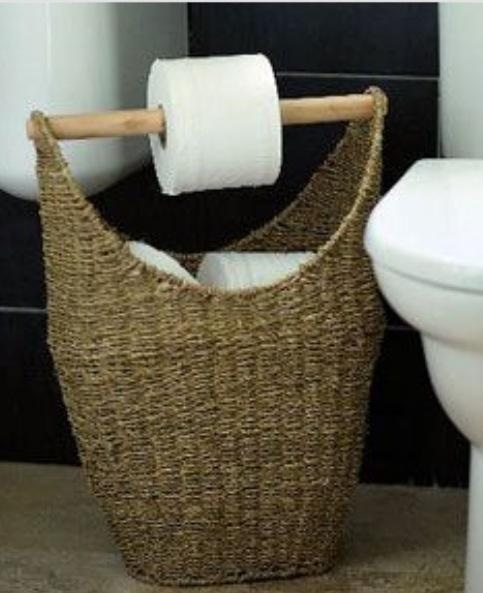 Puó essere, una bella cesta di vimini, o un vaso in vetro cilindrico in cui impilare i rotoli uno sopra all’altro, fate solo attenzione che se il vaso è troppo alto e stretto poi non vi passa la mano per prendere l’ultimo rotolo in basso o restate incastrati, cassette in ferro o legno un po’ vecchie magari trovate in qualche mercatino di antiquariato, anche sul web si trovano idee in merito, la cesta col legno di cui allego foto, è un esempio che ho trovato per caso.