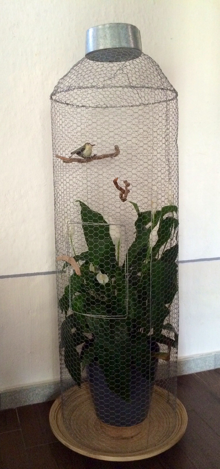 Per l’esecuzione, ho fisicamente lavorato sulla pianta, arrtolandole attorno la rete, in modo che le foglie potessero avere agio, e fissandola, ho rinforzato la struttura con del fil di ferro, ho chiuso la sommità con un “cappello” a semisfera schiacciata, e realizzato una porticina attraverso cui accedere all’interno per la somministrazione dell’acqua e le cure necessarie.