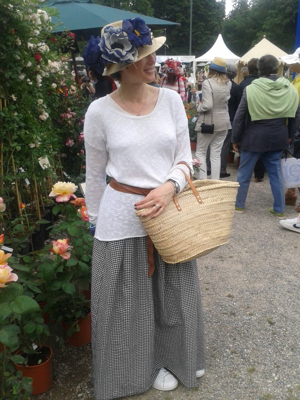 Potevo non adeguarmi alla tradizione? Certo che no! Il giorno prima sono andata a comperarmi i migliori fiori in carta crespa che si possano trovare a Milano, quelli che la signora Franca realizza a mano nel suo atelier in via Custodi 16, tra le mille forme, colori e dimensioni ho trovato i miei, e la sera stessa, il mio cappellino di Borsalino, si e trasformato in un incanto fiorito, ho completato poi il mio look con panier preso in Provenza, una bella gonna in tessuto Vichy bianco e nero e una maglia bianca in lino stretta in vita da una fascia in cuoio un po’ lunga rigirata un paio di volte semplicemente annodata. L’insieme era molto country chic, perfettamente in tema, tanto da meritare, con molto imbarazzo da parte mia, molte foto sia da parte delle agenzie stampa che da parte degli altri invitati.