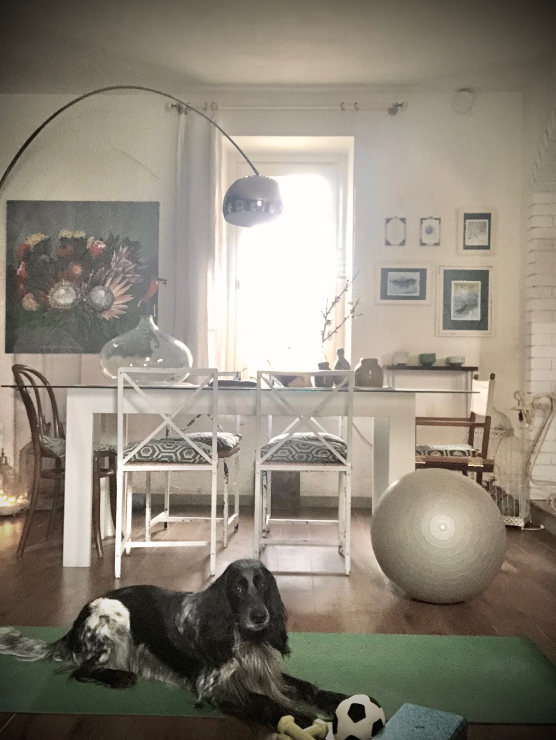 La risposta è stata no, stavo sfruttando male lo spazio, così ho spostato il tavolo più vicino alla finestra, ho messo la mia amata lampada Arco per illuminarne il centro e mi sono resa conto che era molto più accogliente nella nuova posizione, gli ospiti si sarebbero sentiti più accolti e coccolati. Da questo semplice spostamento, mi sono ritrovata ad aver guadagnato uno spazio ampio nuovo e confortevole per praticare yoga, ballare e svolgere i movimenti in totale libertà.